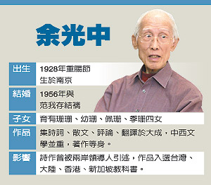 范我存說,余光中全身行頭都是家人幫忙買,只一項(xiàng)無法代勞,“就是鞋子!币?yàn)樾臃堑米约涸,才知合不合腳。