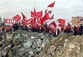 圖:截流成功現(xiàn)場(chǎng)工程人員在圍堰上揮舞紅旗慶賀