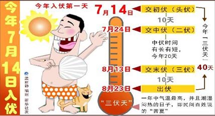三伏天是按照我國古代的“干支紀日法”確定的。每年夏至以后第三個庚日(指干支紀日中帶有“庚”字的日子)為初伏,第四個庚日為中伏,立秋后第一個庚日為末伏,合起來稱為三伏。按陽歷計算則出現(xiàn)在7月中旬到8月中旬。此時我國大部地區(qū)是一年中最熱的時節(jié)……