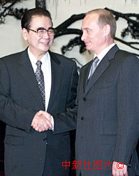 中國全國人大常委會委員長李鵬,7月18日在北京會見俄羅斯總統(tǒng)普京。中新社記者 滿會喬 攝