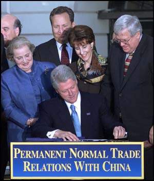 圖文:克林頓簽署PNTR法案 2000年10月11日 11:35 克林頓在多名曾為PNTR法案不斷努力的官員陪同下,正式簽署PNTR法案,為中美關(guān)系邁入一個(gè)歷史性的新里程。 克林頓在總統(tǒng)任期內(nèi)完成心愿,簽署PNTR法案,他形容這是他在任期內(nèi)的一大勝利。(圖據(jù)外電) 中新社華盛頓十月十日電(記者徐德金)美國(guó)總統(tǒng)克林頓今天下午在白宮南草坪舉行儀式,簽署了對(duì)華永久性正常貿(mào)易關(guān)系(PNTR)法案。由此,這項(xiàng)已在國(guó)會(huì)眾議院、參議院通過(guò)的法案成為法律,正式生效。 白宮說(shuō),克林頓簽署PNTR法案是美中關(guān)系的歷史性時(shí)刻,中國(guó)將向美國(guó)的商品與服務(wù)業(yè)打開(kāi)市場(chǎng),加強(qiáng)美中關(guān)系。 中、美兩國(guó)政府于去年十一月十五日在北京簽署關(guān)于中國(guó)加入世界貿(mào)易組織的雙邊協(xié)議,這份被稱作“雙贏”的協(xié)議,促進(jìn)了中美兩國(guó)經(jīng)貿(mào)關(guān)系,也加快了中國(guó)邁向WTO的進(jìn)程。 今年三月,克林頓向國(guó)會(huì)提交了一項(xiàng)關(guān)于給予中國(guó)永久性正常貿(mào)易關(guān)系地位的立法建議。此后數(shù)月,克林頓及美國(guó)聯(lián)邦政府高級(jí)官員不斷呼吁、敦促國(guó)會(huì),盡早審議、通過(guò)PNTR案。今年五月二十四日,眾議院以二百三十七票對(duì)一百九十七票批準(zhǔn)了PNTR案;九月十九日,參議院又以八十三票對(duì)十五票的壓倒性多數(shù)通過(guò)了該案。 該法案生效后,將結(jié)束二十年來(lái)美國(guó)國(guó)會(huì)每年審議一次對(duì)華“正常貿(mào)易關(guān)系”(一九九八年前叫“最惠國(guó)待遇”)的歷史,與中國(guó)建立永久正常貿(mào)易關(guān)系。實(shí)現(xiàn)美對(duì)華永久正常貿(mào)易關(guān)系符合世貿(mào)組織的規(guī)定,符合中美兩國(guó)人民的根本利益,有利于推動(dòng)中美經(jīng)貿(mào)合作和中美關(guān)系繼續(xù)向前發(fā)展。 不過(guò),人們注意到克林頓今天簽署的法案,包含了干涉中國(guó)內(nèi)政、損害中國(guó)利益的內(nèi)容。中方已向美方表明了堅(jiān)決反對(duì)的嚴(yán)正立場(chǎng)。 美國(guó)方面稱,過(guò)去二十年,美中貿(mào)易已從無(wú)關(guān)緊要的水平提高到每年增長(zhǎng)一百四十億美元的水平。今后,美國(guó)產(chǎn)品將更容易進(jìn)入一個(gè)超過(guò)十二億人口的市場(chǎng)。 (完) |