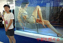 在中國各地舉辦的服裝服飾展示會上,越來越多的服裝廠家采用各種新穎的形式進(jìn)行商業(yè)促銷。圖為江蘇服裝博覽會現(xiàn)場,一廠商用真模特做廣告宣傳內(nèi)衣。中新社記者 錢興強(qiáng) 攝
