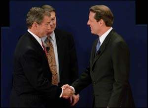 圖文:美國總統(tǒng)候選人展開第二場辯論 2000年10月12日 16:16 ![]() 距離11月7號的大選不足4周,戈?duì)?右)與小布什(左)再度在電視辯論上交鋒。兩人在開始交戰(zhàn)時(shí),先握手示好。 中新網(wǎng)北京10月12日消息:美國民主黨總統(tǒng)候選人、現(xiàn)任副總統(tǒng)戈?duì),與共和黨總統(tǒng)候選人、得州州長布什,已經(jīng)在美東時(shí)間周三晚9時(shí)展開他們的第二場辯論。 這次辯論在北卡羅萊納州的WakeForest大學(xué)舉行,并仍然由公共電視臺(tái)(PBS)的萊勒主持。 這次辯論的方式將不同于第一次。兩位總統(tǒng)候選人采取隨意的談話方式,坐下來回答主持人的提問。這正是布什所擅長的方式。每人有2分鐘的時(shí)間回答提問,在辯論結(jié)束時(shí),有2分鐘的時(shí)間作結(jié)束演講。 估計(jì)兩人會(huì)繼續(xù)就政府角色和架構(gòu)針鋒相對,但中東和平和南斯拉夫局勢等外交問題也會(huì)是辯論的議題之一。 戈?duì)柌际驳牡谝粓鲛q論已于本月3日晚進(jìn)行,原來預(yù)期多達(dá)7,500萬民眾收看首場辯論。但實(shí)際上只有4,600萬人收看了第一場辯論。 首場辯論會(huì)結(jié)束后,美國各大媒體做的民調(diào)顯示,民眾認(rèn)為戈?duì)柕谋憩F(xiàn)略勝布什一籌,但戈?duì)栁茨軘U(kuò)大領(lǐng)先布什的優(yōu)勢。首場辯論對選民并未產(chǎn)生預(yù)期的影響,民調(diào)表明,在首場辯論后,仍然有超過22%的選民心意未決。(圖文據(jù)外電) |