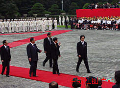 日本首相森喜朗今日在東京迎賓館舉行隆重的歡迎儀式,歡迎中國(guó)總理朱镕基總理訪日。圖為朱镕基在森喜朗首相陪同下檢閱儀仗隊(duì),向歡迎人群揮手致意。中新社記者:王曉暉
