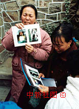 洛陽特大火災遇難者遺體的認領工作28日順利進行。圖為一位剛剛找到兒子遺體的母親痛不欲生地展示兒子生前照片。中新社記者 慎重 攝