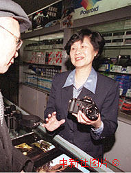 全國人大代表、鳳凰光學股份有限公司副總經(jīng)理嚴志峻(右)十三日利用會議間隙到北京鳳凰相機專柜站柜臺,向顧客介紹鳳凰新產(chǎn)品。作者:王麗南