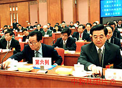全國政協(xié)主席李瑞環(huán)(前左)、國家副主席胡錦濤(前右)十四日出席九屆全國人大三次會議主席團第三次會議時,按表決器。作者:李剛