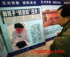 展板宣傳“反邪教” 2001年2月9日 10:37 ![]() 以“反對(duì)邪教、維護(hù)穩(wěn)定、崇尚科學(xué)、傳播文明”為主題的“青年文明社區(qū)反邪教行動(dòng)”,二月在北京市全面啟動(dòng),揭批“法輪功”的圖片展在北京圖書大廈吸引讀者觀看。中新社圖 陸云 攝 |