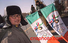 北京街頭申奧氣氛日漸濃烈,市政工人15日在長安街上懸掛申奧彩旗。據(jù)工人稱,他們還將在二環(huán)路、三環(huán)路兩側(cè)掛起近一萬面申奧旗幟。中新社記者 王瑤 攝