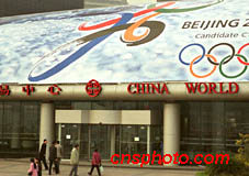 北京國際貿(mào)易中心的透明半拱型屋頂上新裝飾了申奧宣傳海報,碩大的申奧標志顯得十分醒目。中新社圖 陸云 攝