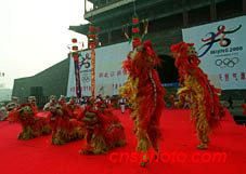 北京正陽門前舉行大型申奧文藝表演,古城樓下群獅起舞歡迎奧委會(huì)嘉賓。中新社圖 史利 攝