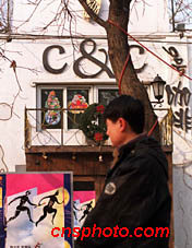 在北京三里屯酒吧區(qū),有一家咖啡館打出申奧招牌,店里店外,帶有申奧標(biāo)志的張貼畫隨處可見(jiàn)。中新社圖 李智勇 攝
