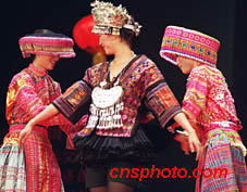 中國新絲路模特赴德國表演團,二十二日在北京嘉里中心飯店舉行專場展示。圖為模特展示中國歷代少數民族服飾作品。中新社圖 東方 攝