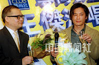 歌星王杰27日在香港出席「尊尚會呈獻王杰演唱會WANG'S 2001」記者會,會上英皇娛樂行政總裁李進與歌星王杰祝酒。中新社傳真 鄧慶樂 攝