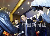 海協(xié)會秘書長李亞飛十六日在出席國臺辦的新聞發(fā)布會后,被中外記者包圍采訪。中新社記者 滿會喬 攝