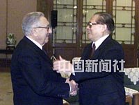 國(guó)家主席江澤民二十日在北京人民大會(huì)堂會(huì)見美國(guó)前國(guó)務(wù)卿基辛格。中新社記者 李剛 攝