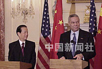 美東時間二十一日晚,中國國務(wù)院副總理錢其琛與美國國務(wù)卿鮑威爾,在美國國務(wù)院大樓舉行會談前會見記者,雙方希望繼續(xù)推進中美兩國關(guān)系向前發(fā)展。中新社圖 京華 攝