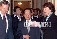 圖:錢其琛會(huì)見(jiàn)美國(guó)國(guó)會(huì)議員 2001年3月23日 09:48 ![]() 美東時(shí)間二十二日早晨,中國(guó)國(guó)務(wù)院副總理錢其琛在華盛頓國(guó)會(huì)山會(huì)見(jiàn)了美國(guó)國(guó)會(huì)議員。圖為參議員克雷格·托馬斯(左)、戴安娜·范斯坦(右)迎接錢副總理。中新社圖 胡啟華 攝 |