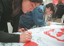 圖文:北大師生簽名支持北京申奧 2001年3月26日 06:36 ![]() 北京大學(xué)二十五日上午舉行萬人簽名活動,全力支持北京申辦2008年奧運(yùn)會。中新社圖 鄭萍萍 攝 中新社北京三月二十五日電(高凱)向來以“心系天下,關(guān)心祖國榮辱”為精神傳統(tǒng)的北京大學(xué)師生,今天在自己的校園里舉行了“萬人簽名支持北京申奧活動”。 在燦爛的陽光下,師生們爭先恐后地涌到簽名臺前,在長達(dá)十幾米的申奧橫幅上寫下自己的名字。有不少人還在上面留下自己對北京申奧的祝福。 雖然此類簽名活動已有不少,但北大此次活動仍有特別意義。北大社團(tuán)文體部部長胡九龍介紹:“現(xiàn)在,距離國際奧委會莫斯科投票的日子越來越近了,北大作為一所名校,希望能在此時為北京申奧出一把力! 一位剛簽完名從人群中擠出的女生告訴記者:“申奧對北京來說是件非常有益的事情,我作為北大的學(xué)生也感到高興,我希望自己能為申奧出一份力。我認(rèn)為我們的申奧也要從細(xì)節(jié)著手。” 一小時后,橫幅上已經(jīng)有了很多簽名,組織者估計(jì),今天至少會有兩千人參加這一活動。 按計(jì)劃,本周內(nèi)這條滿載北大師生美好祝愿的申奧橫幅將被送交北京奧申委。 |