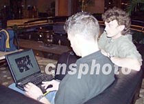 四月三日夜間至四日凌晨,海口文華大酒店中外記者云集,準(zhǔn)備采訪美國(guó)駐華使館預(yù)定在這里舉行爾后取消的記者招待會(huì)。圖為兩名美聯(lián)社記者在現(xiàn)場(chǎng)用電腦發(fā)稿。中新社記者 莫成雄 攝