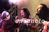 《蒼狼大地》——騰格爾演唱會五日晚在北京舉行,蒙古族歌手騰格爾的母親親手為他穿上蒙古袍。中新社記者 滿會喬 攝