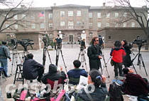 中美撞機(jī)事件引起中外新聞媒體的極大關(guān)注。四月六日,記者們在北京美國駐華大使館門前支起攝像機(jī),安營扎寨。中新社記者 史利 攝