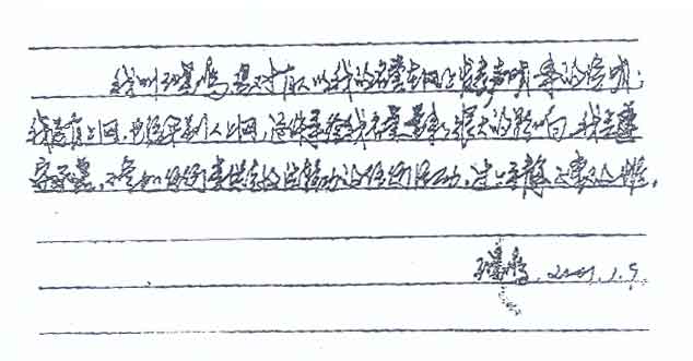 王曉鳴針對“明慧網(wǎng)”謠言的聲明 2001年4月9日 15:50 ![]() "法輪功"網(wǎng)站"明慧網(wǎng)"肆意編造,不斷刊登一些所謂原"法輪功"練習(xí)者對其脫離"法輪功"組織反悔的"聲明"。原武漢市"法輪功"輔導(dǎo)總站副站長王曉鳴得知"明慧網(wǎng)"刊登了她的一份所謂"聲明",非常憤慨,她表示:她沒有上網(wǎng)發(fā)表聲明,也沒有讓別人上網(wǎng)發(fā)表聲明。她指出,這完全是虛假和可恥的行為。 為澄清事實、恢復(fù)自己的名譽(yù),王曉鳴寫下了一書面聲明,全文如下: 我叫王曉鳴,現(xiàn)對有人以我的名譽(yù)在網(wǎng)上發(fā)表聲明一事的說明:我沒有上網(wǎng),也沒要別人上網(wǎng),這件事給我名譽(yù)帶來了很大的影響,我會遵守承諾,不參加任何李洪志法輪功的任何活動,過上平靜正常的生活。 王曉鳴 2001年1月9日 |