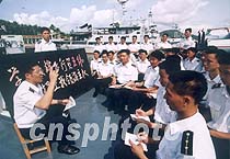 中國海軍駐海南的艦艇部隊官兵日前聽取部隊領(lǐng)導(dǎo)介紹四月一日撞機事件的情況。中新社圖 龍運河 攝