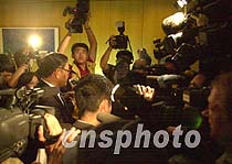 海南省政府外事辦公室主任陳辭十一日晚七時(shí)在?谖娜A大酒店舉行新聞發(fā)布會(huì),宣布中國(guó)外長(zhǎng)唐家璇接受了美國(guó)政府遞交的致歉信,引起記者包圍采訪。中新社記者 賈國(guó)榮 攝