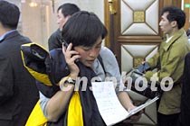 參加中國外交部11日在北京舉行的美國關(guān)于撞機(jī)事件的致歉信記者招待會的記者們在招待會現(xiàn)場用手機(jī)忙于發(fā)稿。中新社記者 李剛 攝