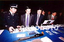 四月十一日下午,深圳市召開嚴厲打擊刑事犯罪分子宣判處理大會,法院對四十五名罪犯進行終審宣判,公安局對三十名犯罪嫌疑人執(zhí)行逮捕。圖為廣東省委副書記、深圳市委書記張高麗(左二)和市長于幼軍(左三)等市領導在查看公安部門收繳的槍支、毒品等物。中新社記者 陳文 攝
