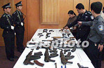 廣東省嚴打整治斗爭戰(zhàn)果顯著,四月以來,全省共破各類刑事案件五千八百起,抓獲犯罪嫌疑人六千多名,繳獲槍枝一百多支。圖為警方展示近日繳獲的槍械。中新社圖 梁永強 攝