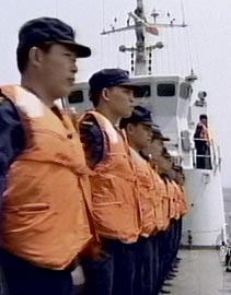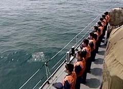 圖文:中國(guó)海軍艦艇為王偉犧牲鳴笛致哀 2001年4月15日 20:08 ![]() 海軍官兵面向南海默哀。