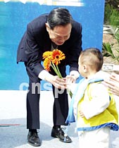 著名物理學(xué)家楊振寧先生,二十六日在北京清華大學(xué)理學(xué)院作《美與物理學(xué)》的報告前,接受一位北京小朋友獻(xiàn)出的鮮花。中新社記者 張勤 攝