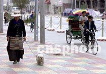 一位牽著狗的藏族老大娘,十三日清晨悠閑地在拉薩市新鋪上彩色地磚的人行道上散步。這條街是江蘇省支援西藏建設的項目之一,被命名為”江蘇路“。中新社圖 趙偉 攝