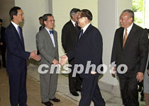 國(guó)家主席江澤民五月九日出席香港特別行政長(zhǎng)官董建華舉辦的午宴前與特區(qū)主要官員握手。中新社傳真 任海霞 攝