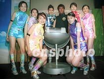 歌星李彩樺、古天樂與一眾亮麗數(shù)碼女郎5日在香港為EPSON 895彩色噴墨打印機作宣傳活動。中新社圖 鄧慶樂 攝
