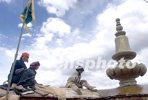 拉薩布達(dá)拉宮金頂五月中旬正在進(jìn)行局部整修,藏族女工在藍(lán)天白云下修復(fù)布達(dá)拉宮墻體。中新社記者 滿會(huì)喬 攝