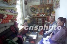 家住拉薩八廓街的藏民嘎色家依靠自編自賣藏式竹籃過著幸福的生活,嘎色在工作之余與鄰居暢飲青稞酒。中新社記者 滿會喬 攝