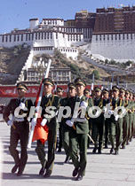 拉薩布達(dá)拉宮廣場二十三日舉行隆重的升旗儀式,慶祝西藏和平解放五十周年。中新社記者 滿會喬 攝