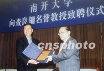 圖文:金庸受聘為南開大學(xué)文學(xué)院名譽(yù)教授 2001年5月28日 10:42 ![]() 著名武俠小說家金庸先生五月二十八日受聘為南開大學(xué)名譽(yù)教授。圖為南開大學(xué)校長侯自新(左)向金庸先生(右)頒發(fā)聘書。中新社記者 孫志民 攝