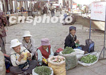 西藏拉薩街頭小販在叫賣野菜,新鮮的野菜為拉薩市民的餐桌更增色彩。中新社記者 滿會(huì)喬 攝