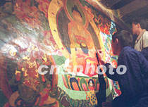 西藏拉薩大昭寺內(nèi)的壁畫正在進行整修,工人在不影響游客參觀的情況下加緊施工。中新社記者 滿會喬 攝