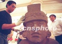 墨西哥專家(左)三十日在北京中華世紀壇內(nèi)安裝瑪雅文物“王子”。包括186件瑪雅珍品的“神秘的瑪雅”--墨西哥文明展將于六月二日向觀眾開放。中新社圖 鄭萍萍 攝