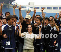 申奧路上札記之二:我們與你們同行(附圖) 2001年6月7日 13:28 ![]() 香港影星“大傻”成奎安在西安與陜西國力隊“比賽”后,連聲對媒體記者說:“好,我們一起為北京加油”。 中新社圖 魏孝明 攝 ![]() 歌手高崎6月6日下午參加鳳凰衛(wèi)視申奧車隊的“明星隊”,準備與陜西國力足球隊一比高低。 中新社圖 魏孝明 攝