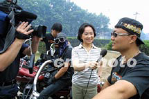 圖:鳳凰衛(wèi)視主持人曾靜漪采訪車友會(huì)隊(duì)友 2001年6月9日 19:44 ![]() ![]() 6月8日上午,萬里行車隊(duì)從西安“絲綢之路”起點(diǎn)出發(fā),當(dāng)?shù)匾卉囉褧?huì)為車隊(duì)送行。圖為鳳凰衛(wèi)視主持人曾靜漪采訪車友會(huì)隊(duì)友。中新社圖 魏孝明 攝