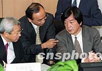 日方代表團(tuán)團(tuán)長(zhǎng)田中均(右)七月三日在北京就中日貿(mào)易磨擦問(wèn)題與中方進(jìn)行正式磋商。圖為田中均與佐野忠克等人談判前交換意見(jiàn)。中新社記者 鄒憲 攝