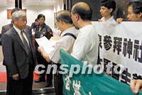 圖:香港團體游行,抗議日本首相參拜靖國神社 2001年08月15日 20:32 ![]() 香港多個團體15日舉行示威游行,抗議日本首相小泉純一郎參拜靖國神社。圖為香港教聯會向日本駐港總領事館遞交抗議信函。 中新社圖 盧峰 攝