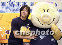 「齊心獻(xiàn)愛寫未來」義賣大行動(dòng)將于18及19日在香港三十多個(gè)大型商場及地鐵站展開義賣行動(dòng),為「中國女童教育項(xiàng)目」籌募經(jīng)費(fèi),圖為陳曉東與義賣精品主角“豬扒家族”成員:豬扒(左)、碧琪(右)。中新社傳真 鄧慶樂 攝
