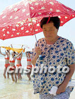 圖:沙灘上的模特與老人 2001年08月19日 16:10 ![]() 日前,在青島參加戴安娜2001世界精英模特大賽中國(guó)預(yù)選賽的模特選手,來(lái)到風(fēng)景秀麗的金沙灘景區(qū)拍攝。圖為一位沙灘漫步的打傘老人匆匆從身穿泳裝模特身邊走過(guò)。中新社記者 錢(qián)興強(qiáng) 攝
